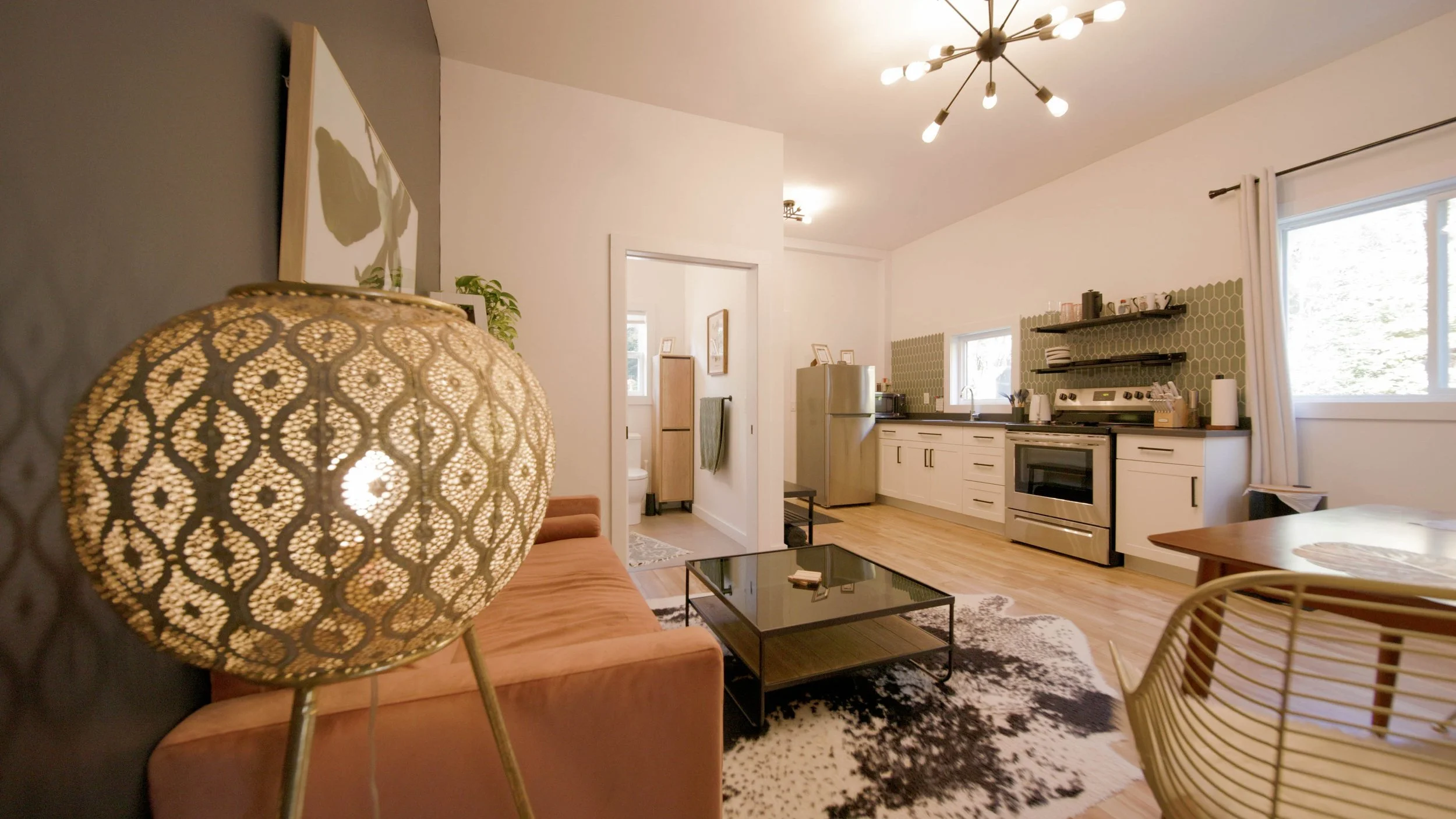 Flora is a bright, inviting studio suite designed as a peaceful retreat for two or a solo getaway. Inside you’ll find a fully equipped kitchen, games, books, and a Canadian-made memory foam king bed for ultimate comfort.